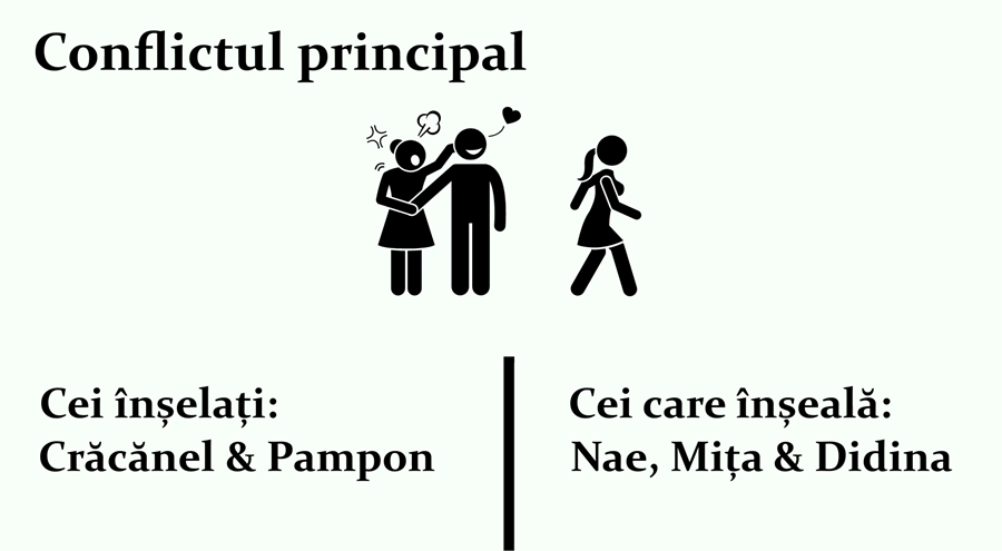 Concluzionăm: conflictul principal include obligatoriu și triunghiul Nae – Didina – Mița (Nae este cel care înșeală, cele două femei fiind cele înșelate).