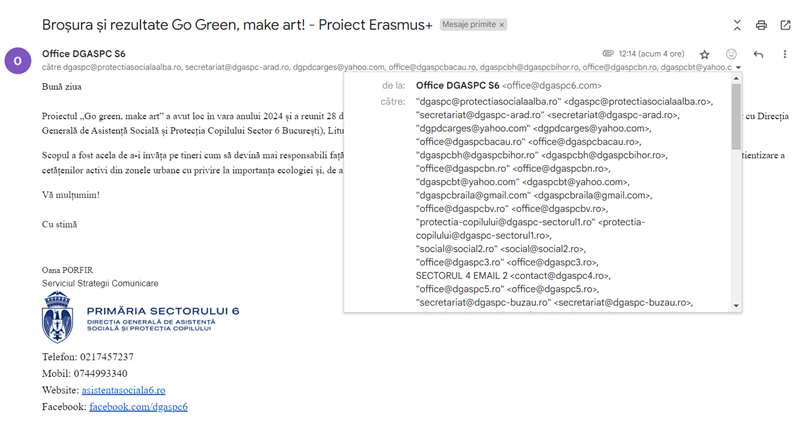 Broșura proiectului Go Green, Make Art! a ajuns la toate sediile DGASPC din România. Schimbul nostru de tineri și tot ceea ce am făcut reprezintă un rezultat cu care ne mândrim, așa că am dorit să îl punem la dispoziția tuturor celor care ar putea fi interesați. Evident, împreună cu oferta de a ajuta, explica, susține orice demers potențial viitor. Vă mulțumim!