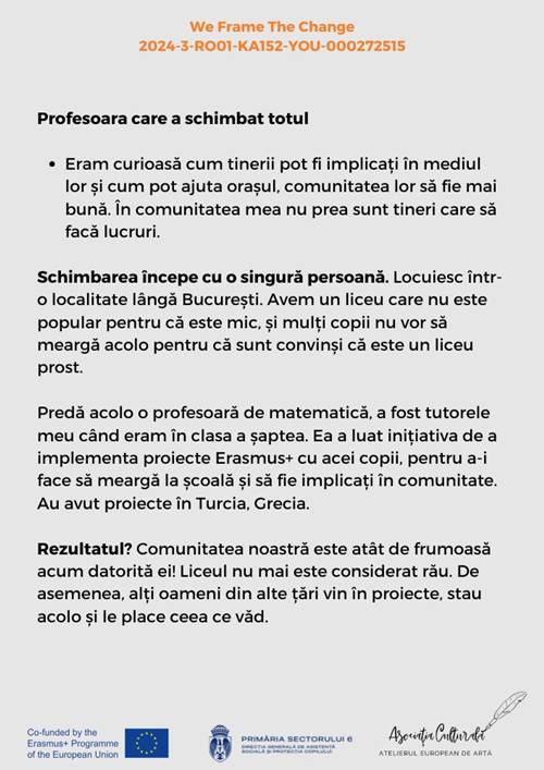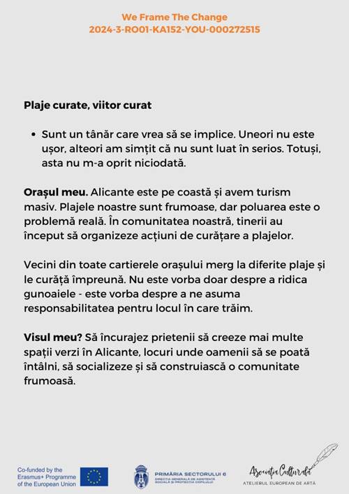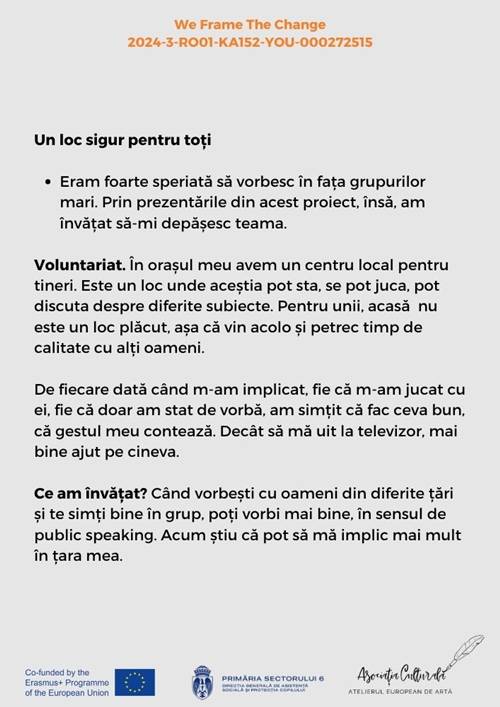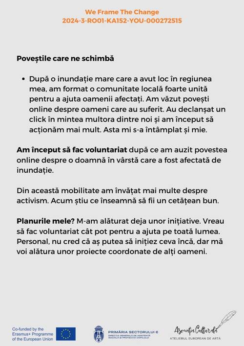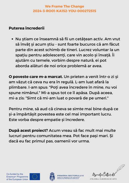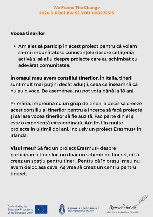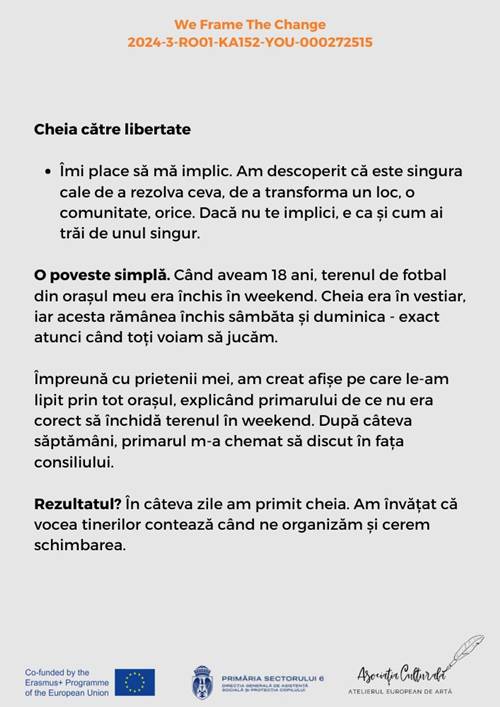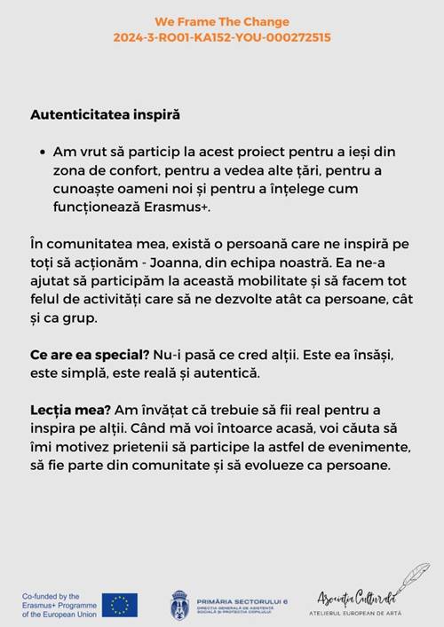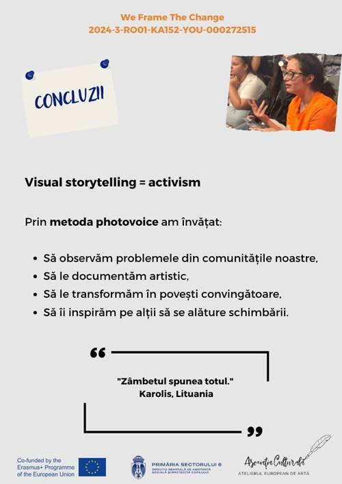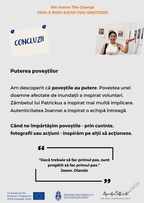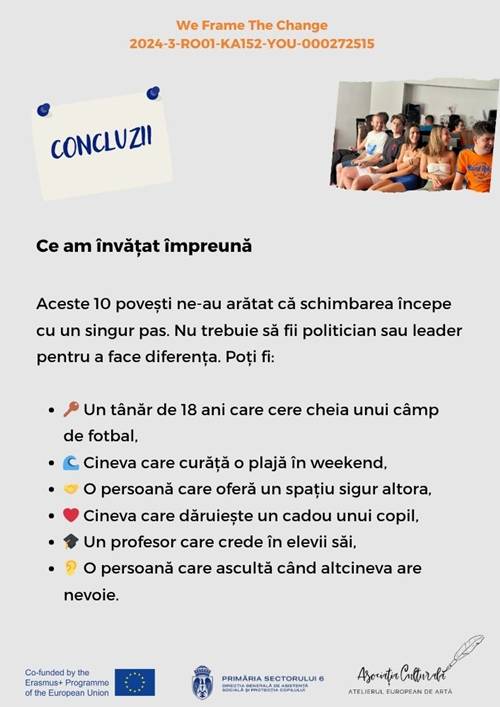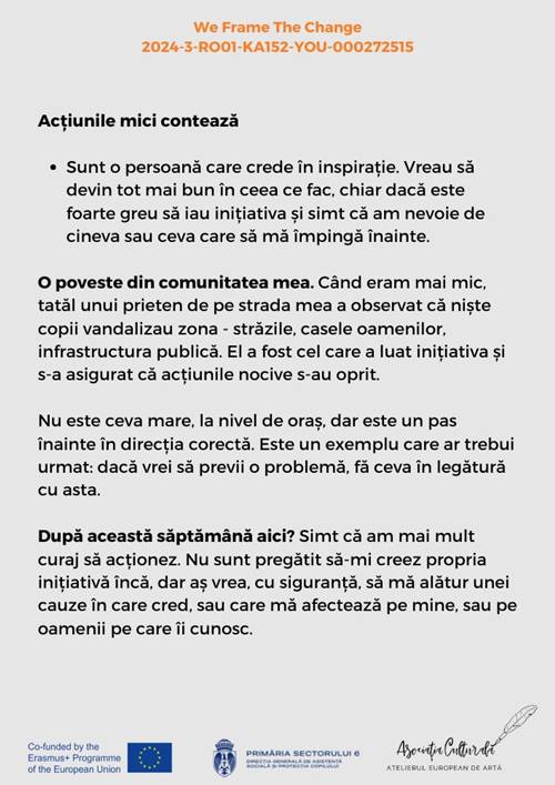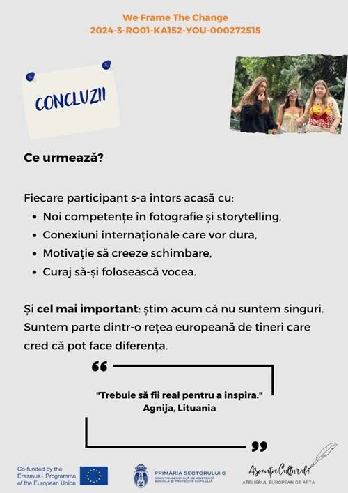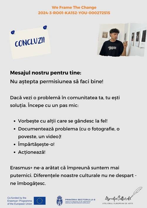 Proiectul Erasmus+ „We Frame The Change” (2024-3-RO01-KA152-YOU-000272515) a pornit de la o premiză simplă, dar puternică: arta, și în special fotografia, poate fi o punte între dorința de a acționa și publicul pe care tinerii vor să îl mobilizeze pentru schimbare. Prin metoda photovoice, participanții au învățat să observe problemele din comunitățile lor, să le documenteze artistic și să le transforme în povești convingătoare.