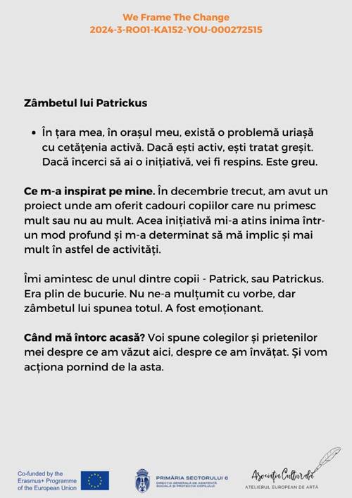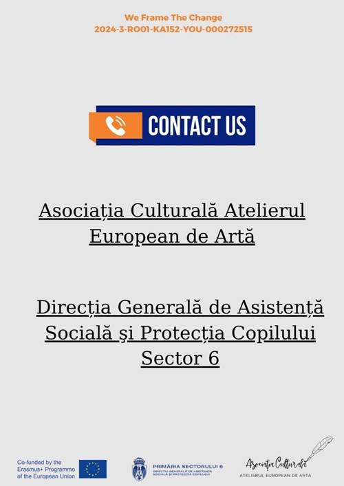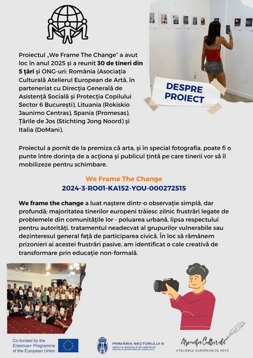 Proiectul a fost organizat de Asociația Culturală Atelierul European de Artă, în parteneriat cu Direcția Generală de Asistență Socială și Protecția Copilului Sector 6 București și alte patru organizații europene. Prin educație non-formală și visual storytelling, tinerii participanți au dobândit nu doar competențe în fotografie, ci și curajul de a-și folosi vocea pentru a inspira schimbarea în comunitățile lor.