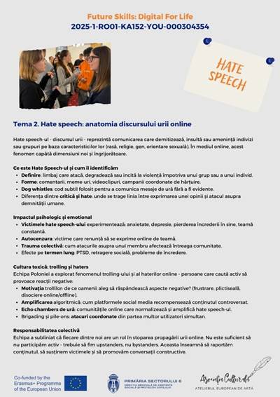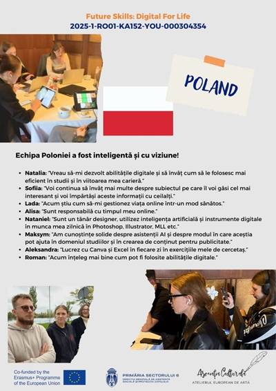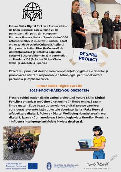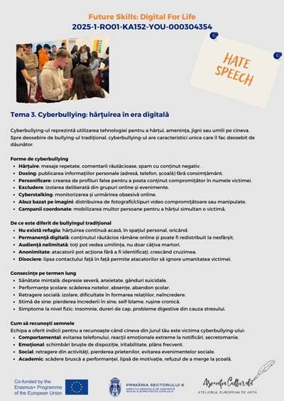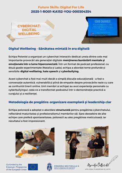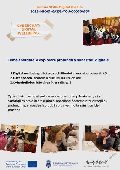 În cadrul proiectului Erasmus+ „Future Skills: Digital for Life”, echipa Poloniei a realizat un cyberchat dedicat bunăstării digitale și provocărilor cu care se confruntă tinerii în spațiul online: hate speech și cyberbullying.