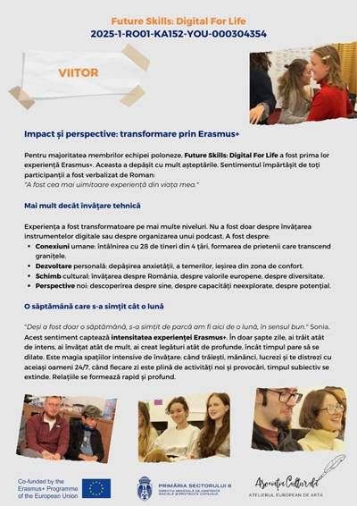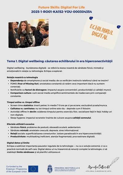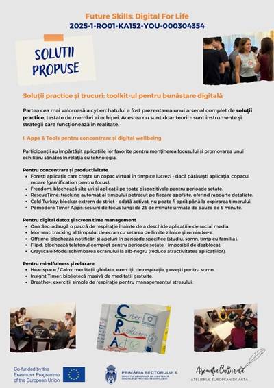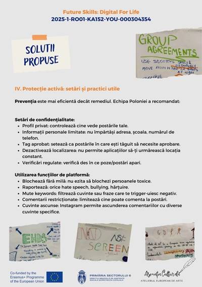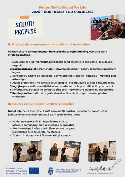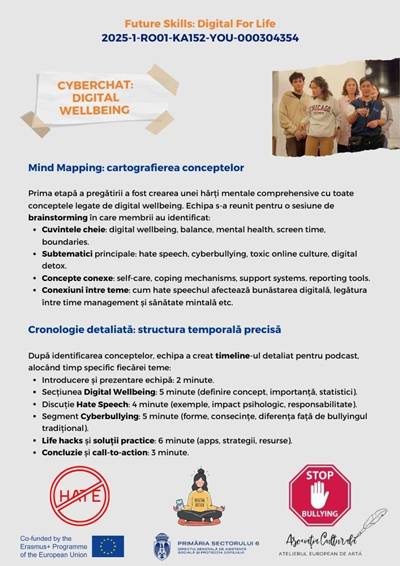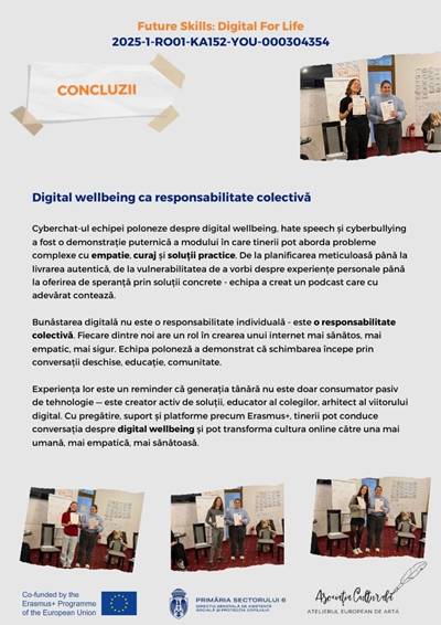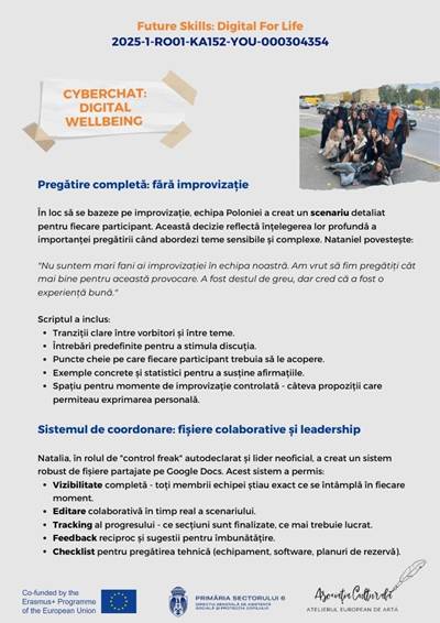 Tinerii beneficiari ai proiectului din Polonia au explorat în profunzime dimensiunile echilibrului digital – de la gestionarea timpului petrecut online și impactul psihologic al rețelelor sociale, până la strategii concrete de recuperare după expunerea la discursul urii și hărțuirea cibernetică. Cyberchat-ul lor oferă soluții practice și „life hacks” pentru menținerea sănătății mentale în era digitală.